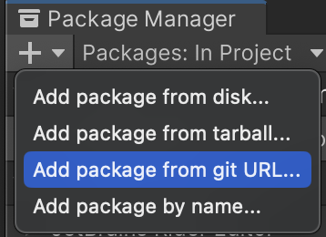 This approach uses Unity’s Package Manager to add TTG to your project using the repo’s git URL. To do so, navigate to Window > Package Manager in Unity. Then click on the + and select “Add package from git URL”: